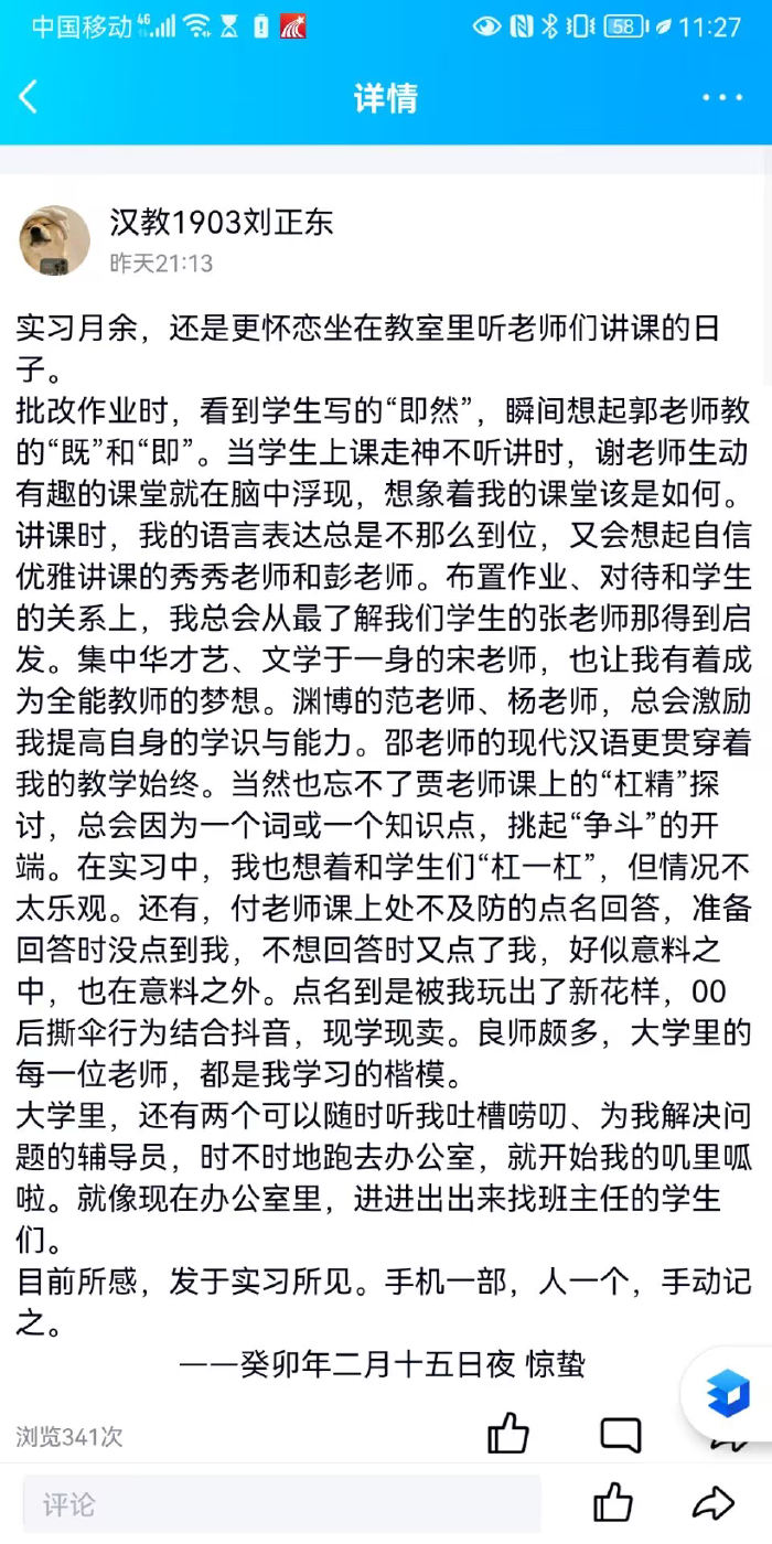 “本是当成实习周志来写的,可写着写着,对大学听课学习生活的怀念,对老师的思念一点一滴涌上心头……”据了解,刘正东是该校汉语国际教育专业的大四学生,现正在十堰市房县七河中学实习。