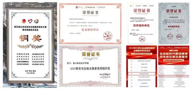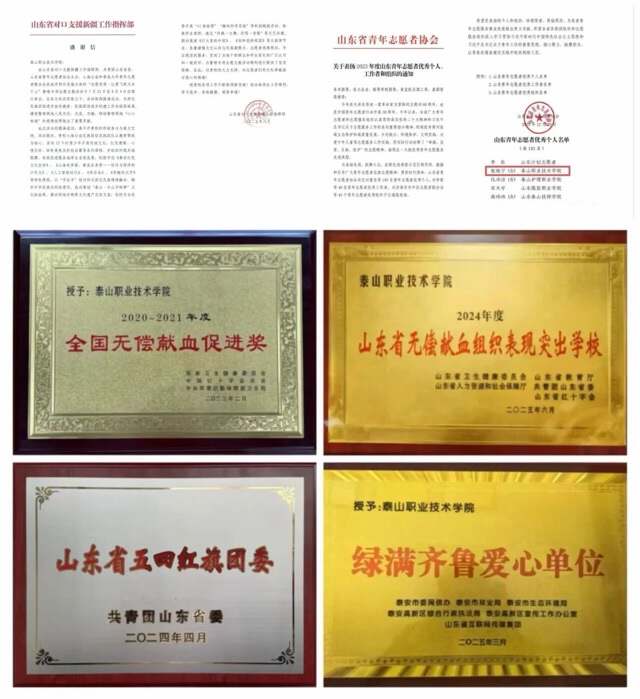 多年来,学校持续聚焦精神文明建设、公益志愿服务与数字化转型等重点领域,在省市各级评优中屡创佳绩。先后荣获2020-2021年度“全国无偿献血促进奖”、2022-2025年“山东省无偿献血组织突出奖”,2024年获评“山东省五四红旗团委”、第五届山东省青年志愿服务项目大赛铜奖,2025年入选“绿满齐鲁爱心单位”。近年来,多次在“一起云支教”专项活动中获评“优秀宣传高校”“优秀组织高校”等称号,并与泰安日报社共建“望岳·梦想泰职”校媒融合工作室。这些成果充分彰显了学校在新时代践行育人使命、履行社会担当的积极作为。